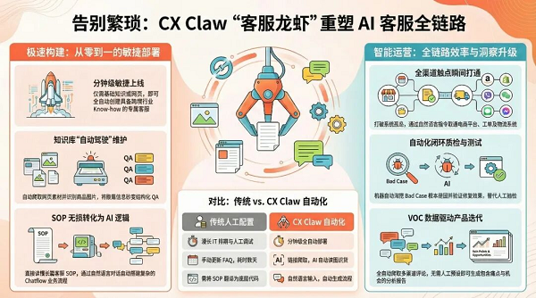 告别过去“纯人工配置”的漫长周期,CX Claw(客服龙虾)将繁杂的搭建、测试与运营工作全面接管,真正实现AI落地全链路的自动化: